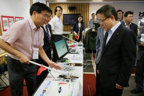 ▲ 롯데홈쇼핑 신 헌 대표(오른쪽)가 중소기업 박람회에 참석한 모습.