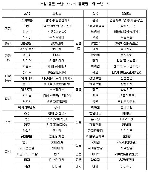 전자 부문 웅진코웨이(정수기), 통신 부문 SK텔레콤(이동통신), 생활용품 부문 아모레퍼시픽(화장품)과 화이트(생리대), 주류 부문 참이슬(소주), 외식 및 식음료 부문 파리바게뜨(베이커리), 롯데리아(햄버거), 서울우유(우유), 롯데제과(과자), 동원참치(참치캔), 금융 부문 삼성생명(생명보험), 유통부문 이마트(할인마트), 건설 부문 래미안(아파트)등이 주인공이다.