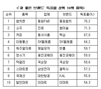 50% 이상의 독보적인 지지율로 1위를 차지한 브랜드는 동원참치(참치캔) 외에도 참이슬(소주), 맥심(커피), SK텔레콤(이동통신), 빈폴(캐주얼의류), 웅진코웨이(정수기), 국순당(막걸리), 갤럭시(스마트폰), KAL(국제선), 이마트(할인마트)등이였다.