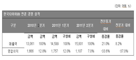 한국타이어(부회장 서승화)의 2분기 매출액이 1조5천억을 넘어서면서 전년동기 대비 20% 이상 신장했다. 반면 영업이익은 40% 가까이 떨어져 대비를 이뤘다.