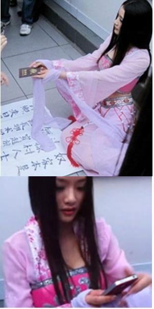 지난 19일 중국 동영상 사이트에는 긴 생머리의 미모의 여성이 선녀 복장으로 구걸하는 영상이 올라왔다.