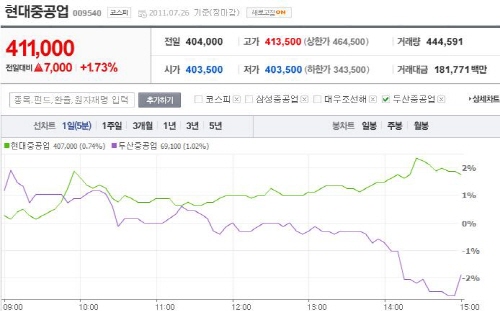 ▲현대중공업(보라색)과 두산중공업(녹색)의 26일 주가 등락