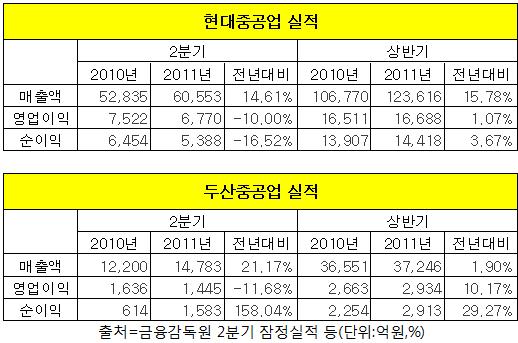 현대중공업과 두산중공업이 2분기 영업이익이 약 10% 빠진 실적을 발표했으나 주가가 상반된 움직임을 보이고 있어 주목되고 있다.