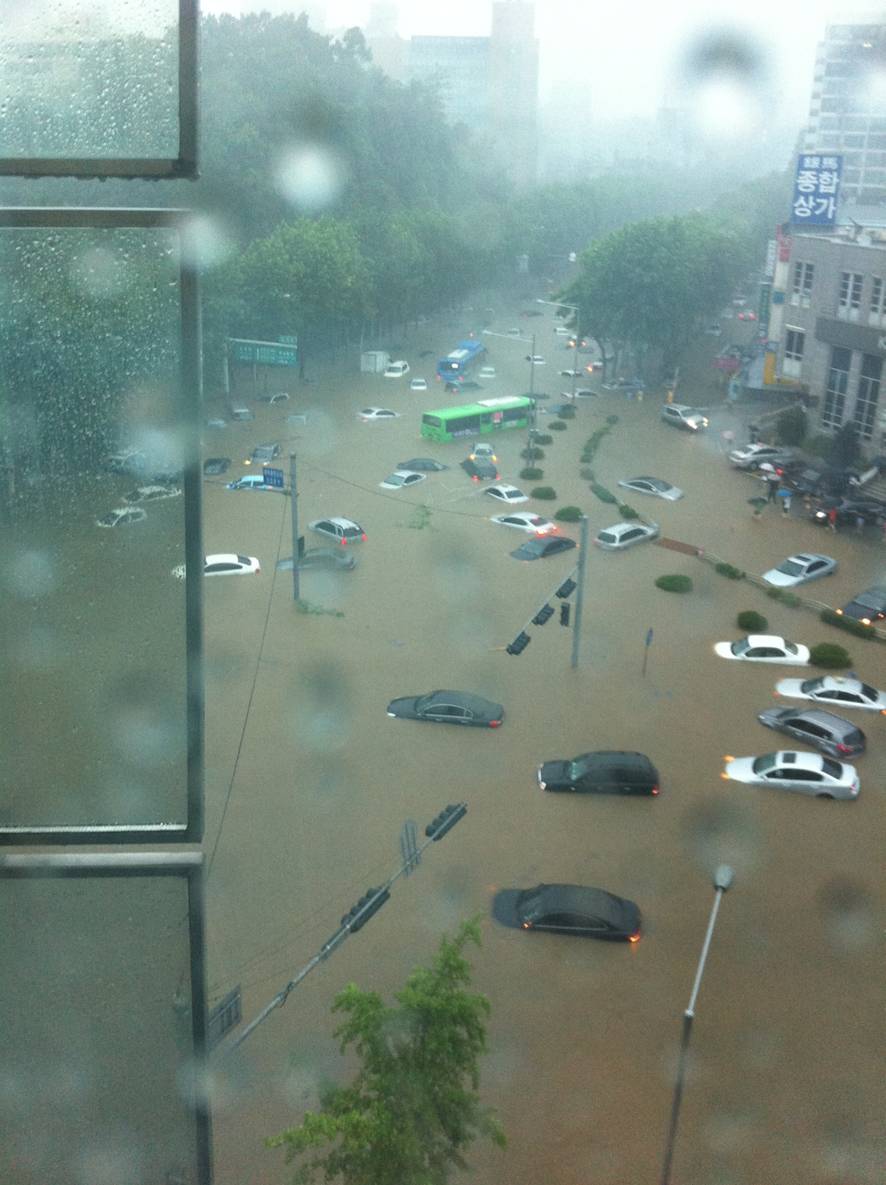27일 아침에 트위터에 오른 사진중 눈에 띄는 기사 아래 첫번째 사진은 **haru란 트위터리안이 올린 것으로 서울 서초구 양재초등학교 앞이 침수돼 차들이 완전히 잠겨버리고 지붕만 간신히 보이고 있는 모습이다.