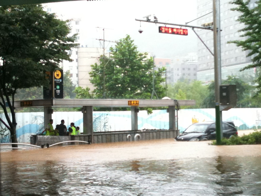서울 지역에 시간당 40mm로 내린 폭우로 강남역, 대치역 , 사당역, 우면산 일대의 침수로 서울 도심이 마비됐다.