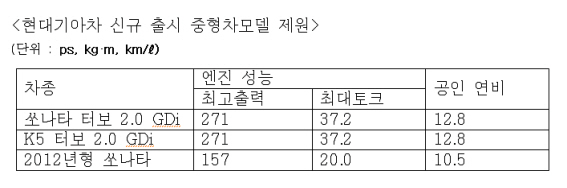 ‘쏘나타 2.0 터보 GDi’와 ‘K5 2.0 터보 GDi’ 모델의 연비는 12.8km이다. 이는 3000CC 이상 준대형 차종 중에서는 독보적인 연비로 배기량 대비 높은 출력을 실현하는 엔진 다운사이징을 통해 이뤘다.