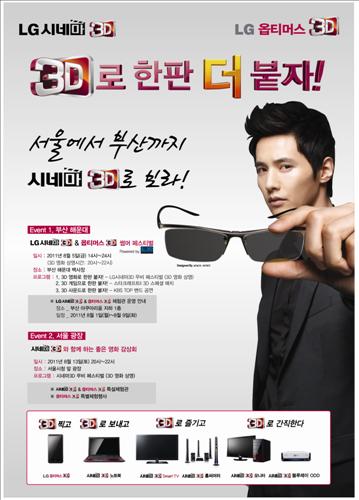 LG전자는 최대 1만여명이 동시에 시네마 3D 안경을 쓰고 3D 영화를 감상하는 대규모 야외 3D 영화 상영회를 서울과 부산에서 잇따라 개최한다고 28일 밝혔다.