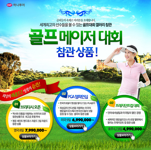 그 첫번째는 세계 4대 메이저 대회 중 하나인 PGA 챔피언십 '2011 The Tour Championship'. 하나투어는 '2011 The Tour Championship - 7일' 상품을 선보이며, 오는 9월 미국 아틀란타 이스트 레이크 골프클럽에서 펼쳐지는 대회 2일 참관 및 세인트 말로 골프 코스와 비어 베스트 아틀란타 골프 코스에서 각각 18홀, 27홀 라운드하는 상품으로 699만원에 출시했다.
