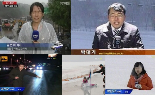 또한 MBC 양현승 기자는 빙판길 승용차 충돌 사고 현장을 재현하기 위해 얼어붙은 도로 위에서 미끄러지는 모습을 연출해 ‘양미끌’로 불렸으며 해빙기 익사사고의 위험성을 보도했던 MBC 조의명 기자는 실제로 얼음이 깨져 물에 빠지는 사고로 ‘조풍덩’기자라는 애칭을 얻기도 했다. (사진=YTN, KBS, MBC 방송 캡처)