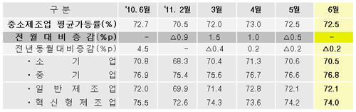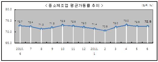 중소기업 평균가동률은 지난 4월 최고치(73.0%) 기록 이후 소폭 하락하며 큰 변동이 없는 수준을 유지했다.