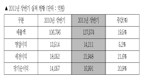 이익도 증가했다. 상반기 영업이익 1조4천211억원은 전년동기(1조3천514억원)에 비해 5.2% 늘어난 수치이다.