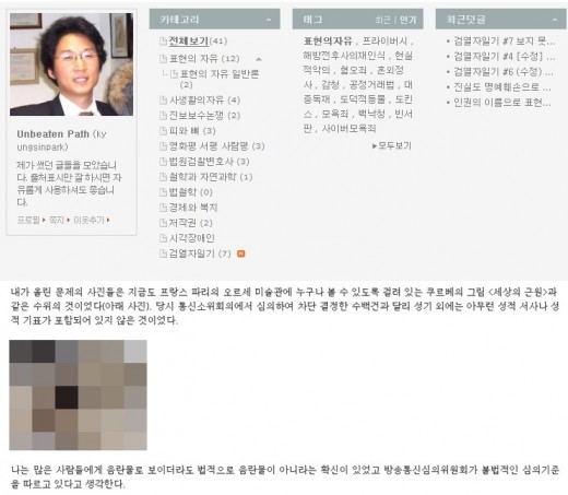 지난 27일 두 게시물을 수정하긴 했으나 박 위원은 이날 "검열자일기 #7 보지 못한 사람들을 위하여"란 제목의 글과 함께 여성 음부를 담은 귀스타브 쿠르베(1819~1877)의 그림 '세상의 근원'을 올렸다.