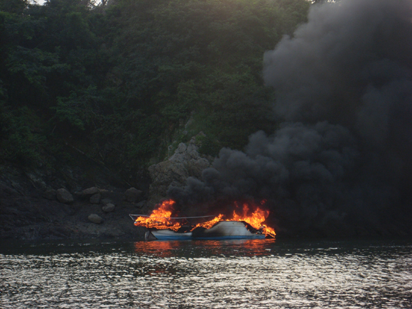 신고를 받은 태안해경 상황실은 인근 해상에서 경비중인 P-68정 등 2척을 현장으로 급파하는 한편, 화재선박 근처에 있던 레저보트 아리랑호에 신속하게 연락하여 부부를 구조하였으며 현장의 화재선박은 곧이어 도착한 경비함정이 화재를 진압중에 침몰하였다.