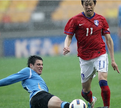 4명의 수비진에는 이기제 장현수 황도연 임창우, 수문장으로는 양한빈이 낙점됐으며 경기는 김경중의 결승골로 2-0 승리를 거뒀다.(사진-연합뉴스. 우루과이전 김경중)