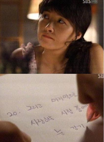 7월 31일 SBS 주말드라마 ‘여인의향기’에서는 김선아가 죽기전에 하고 싶은 일들이나 목표를 적은 버킷리스트를 써내려갔다.