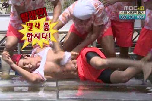 이날 방송에서 소지섭은 무한도전 멤버들에게 얼음판 위에서 벌칙을 당했다.