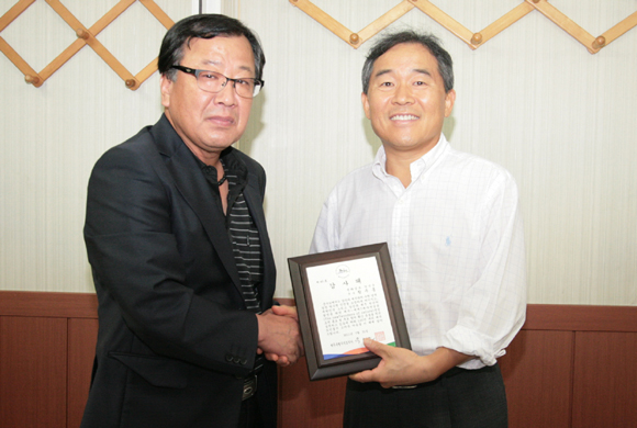 제39회 강진청자축제 개막식에 참석한 김영훈 전 제주시장이 지난 7월 31일 황주홍 강진군수에게 감사패를 전달했다.