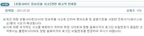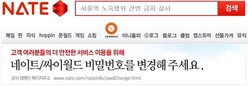 관계자는 이어 “현재로선 네이트나 싸이월드, 또 동일한 정보로 가입한 타 사이트의 비밀번호를 변경하는 것이 피해를 줄일 수 있는 최선의 방법”이라며 “회사에서도 사이트 메인화면에 공지를 띄워 회원들이 쉽게 변경할 수 있도록 안내하는 등 최선의 노력을 다하고 있다”고 덧붙였다.