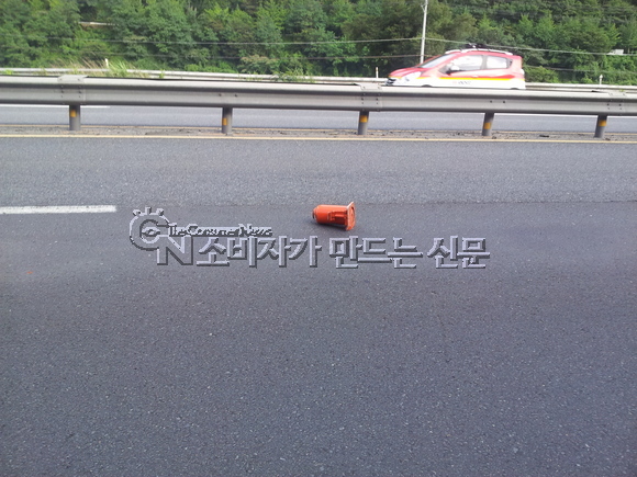 잠시 차량이 뜸한 사이 가까이 가 정체불명의 물체를 확인해 보니 차량 정비시 사용하는 지지대의 일부분이 떨어져 나간 것이었다.