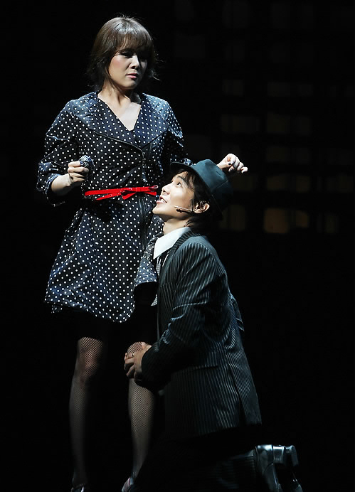 옥주현이 3일 lg아트센터 뮤지컬 '아가씨와 건달들'에서 열연, 뉴욕 핫박스 최고의 순정파 쇼걸 '아들레이드'로 뛰어난 가창력을 뽐내고 있다. 특히 옥주현의 너무 가냘픈 다리가 관객들의 시선을 끌었다.