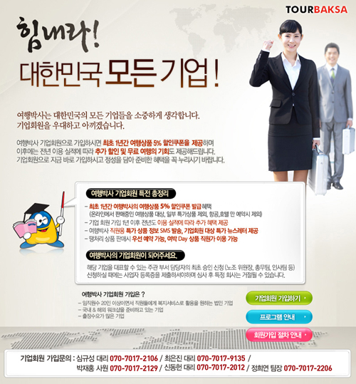 여행박사 기업회원 가입 페이지에서 간단한 기업정보와 신청인 정보입력만으로 간편하게 가입할 수 있다. 기업회원으로 가입이 되면 해당 기업의 임직원 본인에 한해 5% 할인이 적용되며 여행사 직원용 특가 상품정보를 SMS 문자메시지로 받아볼 수 있고 기업회원 대상 특가 뉴스레터도 수신 가능하다.