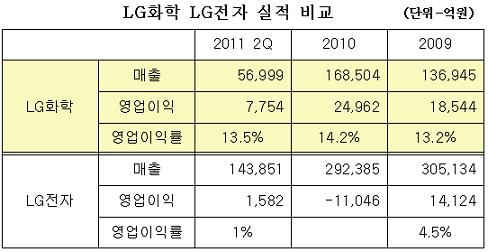 2010년과 2009년을 살펴봐도 매출이 절반에 불과한 LG화학의 영업이익이 LG전자를 압도하고 있다.