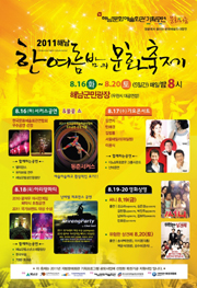 해남문화예술회관은 오는 16일부터 20일까지 5일동안 매일 저녁 8시에 해남군민광장에서 ‘2011 해남 한여름밤의 문화축제’를 연다.