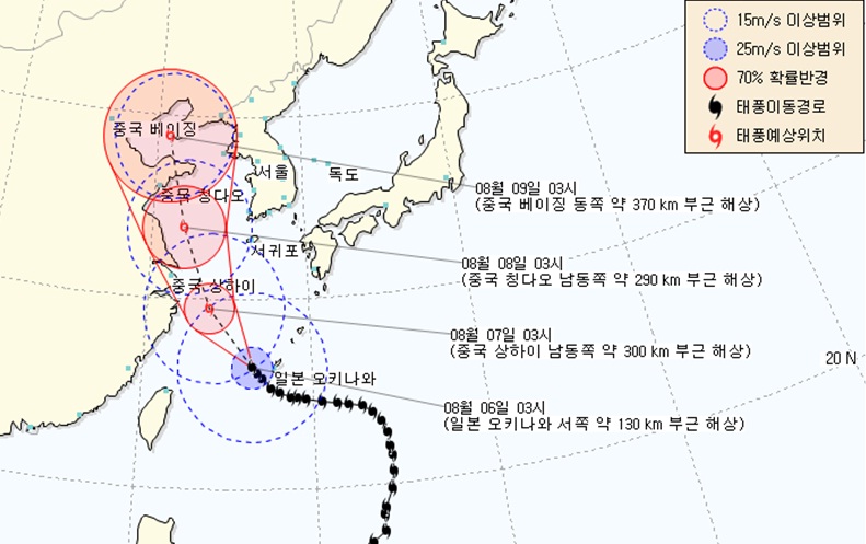URL복사 기사공유하기 스크랩 프린트 메일보내기 글씨키우기 오는 6~8일 제9호 태풍 무이파의 영향으로 천둥번개를 동반한 비가 내릴 예정인 것으로 나타났다. 지난 5일 기상청에 따르면 무이파는 일본 오키나와 서남쪽 해상에서 시속 13km 속도로 북서진 하고 있으며 해안을 따라 발해만으로 북상할 예정이다. 이에 시간당 30~50mm 이상의 비가 내릴 것으로 전망되며 해안가 해일 가능성이 높은 것으로 전해졌다. 저작권자 © 소비자가 만드는 신문 무단전재 및 재배포 금지 온라인 뉴스팀 다른기사 보기 URL복사 기사공유하기 주요기사 삼성전자, 중남미 AI 가전 판매량 40%↑...'비스포크 AI 콤보' 매출 80% 늘어 삼성카드, 2026년 정기 임원인사... 상무 3명 승진 삼성자산운용, 임원인사 실시…부사장 1명 승진 삼성증권, 정기 임원인사 단행…부사장 1명·상무 4명 승진 동아제약 '오쏘몰', CU·GS25에서 '오쏘몰 이뮨 1일분' 출시...소비자 접점 확대 삼성화재, 2026년 정기 임원인사 실시... 부사장 4명·상무 7명 승진