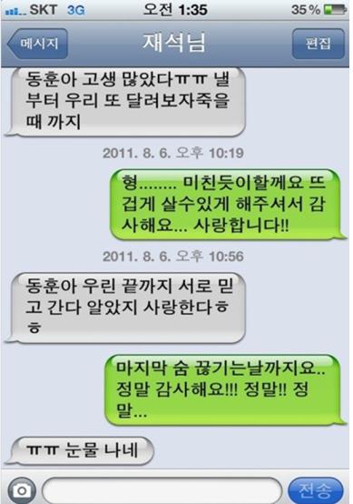 공개된 문자 메세지에서 유재석은 "동훈아. 고생 많았다. 내일부터 우리 또 달려보자. 죽을 때까지"라며 하하에게 격려를 보냈다.