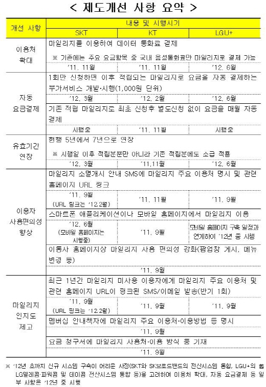 한편, 이번 개선안 중 SMS 통보·홈페이지 개편 및 요금청구서 기재 등은 올해 9월부터, 자동 요금결제·유효기간 연장 등 사업자별 전산개발이 필요한 사항은 2012년 상반기까지 순차적으로 시행될 예정이다.