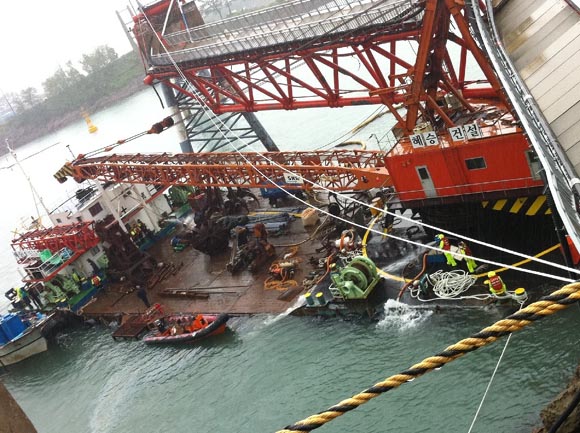 현재 장자대교 상판이 바지선 크레인을 누르고 있어 바지선이 선수부분은 침수된 상태이고 후미 부분은 약 1m가량 수면 위로 올라와 있는 상태다.