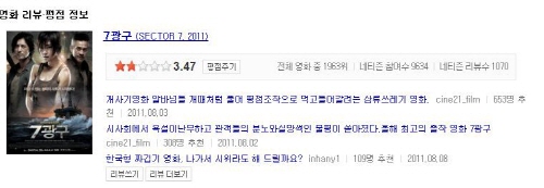 네티즌들은 7광구에 대해 "말도 안되는 영화", "돈이 아깝다", "이게 왜 1위인지 모르겠다" , "하지원이 불쌍해" 등의 반응을 보였다. (사진=네이버 캡처)