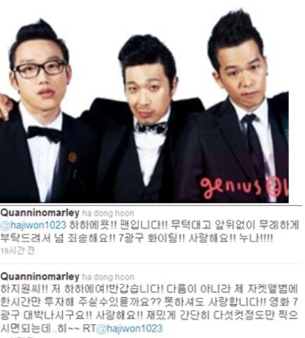 하하는 9일 하지원의 트위터에 “하지원씨. 저 하하에여!반갑습니다! 다름이 아니라 제 앨범 재킷에 1시간만 투자해 주실 수 있을까요??못하셔도 사랑합니다!! 영화 ‘7광구’ 대박나시구요. 사랑해요. 재밌게 간단히 다섯 컷 정도만 찍으시면 되는데..히~~”라고 남겼다.
