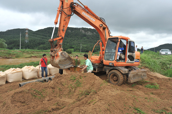 복구 작업에는 포크레인 56대, 덤프 14대, 톤 백 마대 1천600매 등의 장비가 도로와 제방 복구에 투입됐다.