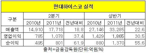 11일 금융감독원에 따르면 현대하이스코는 올 상반기 영업이익이 지난해 동기대비 30.5% 증가한 1천865억원을 기록했다. 2분기 실적은 지난해(785억원)보다 무려 37.4% 증가한 1천78억원을 달성했다.