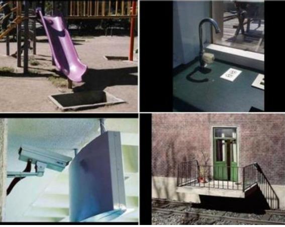 황당 건축물들의 사진을 보면 바닥에 구멍이 뚫린 미끄럼틀과 수도꼭지 아래의 콘센트 철길 위의 발코니, 벽에 가로막힌 계단, 앞이 가로막힌 CCTV 등 재미있고 황당한 건축들이 눈길을 끈다. (사진=허밍턴 포스트)