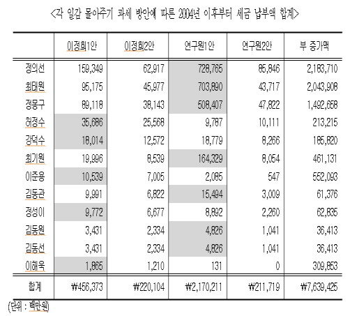 허정수 GS 네오텍 회장의 과세 예상액은 1안 98억원, 2안 101억원이었으며, 강덕수 STX 회장은 1안 187억원, 2안 82억원으로 나타났다.