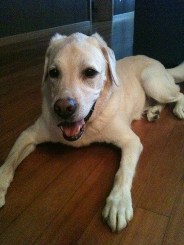 사진 속 안내견 테라는 마루 바닥에 앉아 카메라를 응시하고 있다.