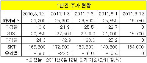 STX는 하이닉스 인수에 나설 것으로 알려졌던 지난 7월6일 이후 주가가 28.6%나 주저앉았다. 이기간 동안 하이닉스와 SK텔레콤은 각각 25.5%, 16% 빠졌다.