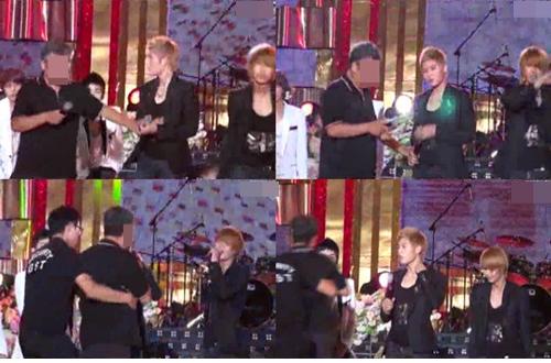 이 남성은 무대에 올라 케빈의 마이크를 빼앗은 뒤 동준을 옆으로 밀쳐냈다. 당황한 동준은 머리를 긁적이며 잠시 노래를 멈췄고 다른 멤버들 역시 당황하는 기색이 역력했다.