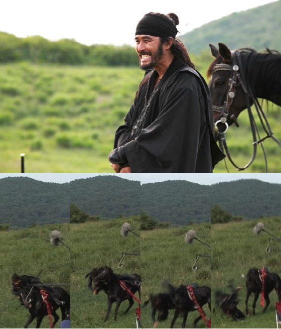 최민수가 ‘액션’ 싸인과 함께 말과 함께 질주하며 한 손으로 칼을 던지는 순간, 갑자기 말이 고개를 돌리며 방향을 틀어 무게중심을 잃고 말았다. 순간 말에서 떨어진 최민수는 땅으로 손을 뻗어 회전 낙법으로 몸을 굴려 다행히 큰 사고를 모면했다.