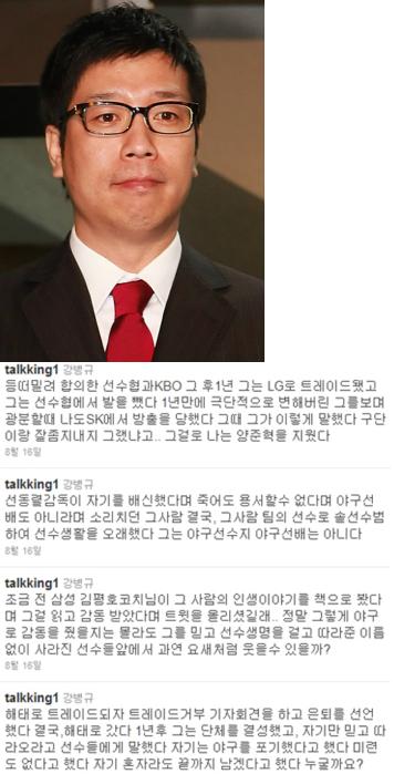 강병규는 지난 16일 트위터에 “해태로 트레이드 되자 트레이드거부 기자회견을 하고 은퇴를 선언했다. 결국 해태로 갔다. 1년 후 그는 단체를 결성했고 자기만 믿고 따라오라고 선수들에게 말했다. 자기는 야구를 포기했다고 했다. 미련도 없다고 했다. 자기 혼자라도 끝까지 남겠다고 했다. 누굴까요?”라는 글을 올렸다.