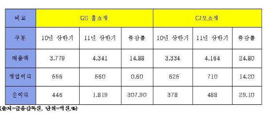 반면 순이익은 GS홈쇼핑이 1천819억원으로 작년동기 대비 307.9%나 늘어났다.CJ오쇼핑은 29.1% 늘어난 488억원 기록했다.