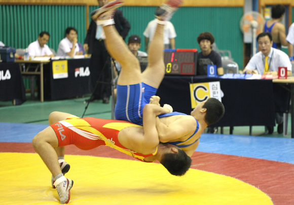 17일 전남 강진군 강진국민체육센터 실내체육관에서 계속된 제 39회 문화체육관광부장관기 전국학생레슬링대회 겸 제 35회 전국대학생레슬링선수권대회에서 고등부 그레코로만형 출전 선수들이 경기를 펼치고 있다.