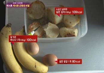 어머니가 직접 싸줬다는 도시락에는 바나나, 감자, 삶은 달걀만 들어 있어 모두 합해도 300kcal이 넘지 않는 저칼로리 식단이었다.