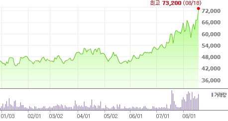 이같은 실적 호조에 힘입어 올 초 4만5천원이던 주가는 현재 7만2천400원으로 38% 상승했다. 몇 차례 8% 이상 급락하기도 했지만 전반적으로 꾸준한 상승세를 이어왔다.