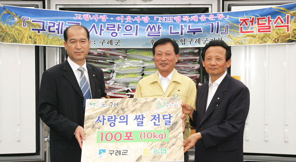 또한, 농협은 추진 중인 ‘NH 행복채움운동, 사랑의 쌀 나눔행사’에서 모금한 10kg 쌀 100포대를 소외계층에 지원해달라고 구례군에 전달했다.