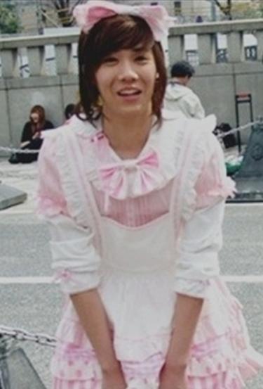 사진에는 아이돌밴드 FT아일랜드의 멤버 이홍기가 핑크 메이드 복을 입고 머리에는 리본을 달고 미소짓고 있다.