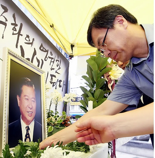 18일 오전 경기도 구리시 수택동 돌다리공원에서 열린 김대중 대통령 서거 2주기 추모식에서 추모객들이 김 전 대통령의 영정 앞에서 헌화하고 있다.