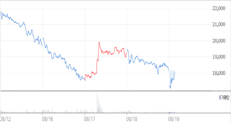 이에 따라 주가도 하락세이다. 지난 2일 2만2천650원를 기록했던 주가는 이후 하락세를 거듭, 18일에는 1만8천150원까지 떨어졌다.